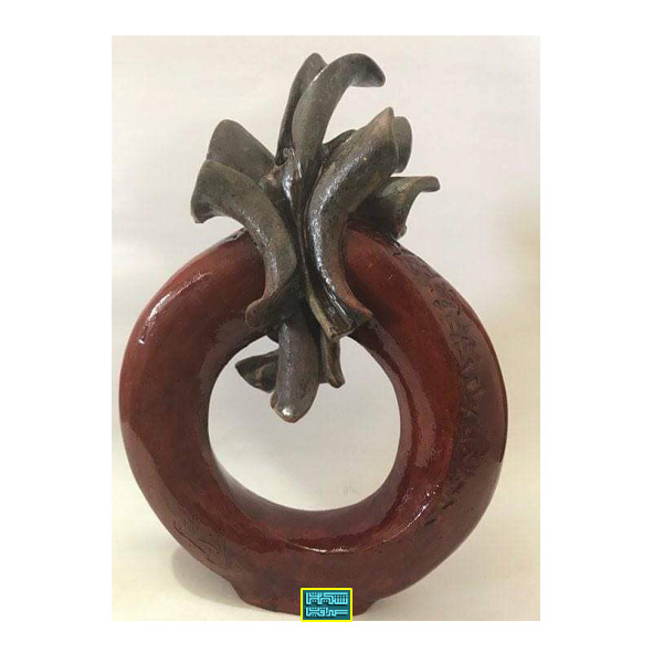 About the work: The visual scene, composed of a semi-oval ceramic sculpture topped with twisted strips at varying levels, was executed using a contrasting color (dark silver-gray), achieved by using lead glass at a specific temperature. The rest of the work relied on an oxidizing technique followed by a light coating of clear glass to create a subtle sheen. The artistic characteristics of the piece lie in its transition from abstraction to expression. The potter emphasized the symbolic expression of social thought, transcending traditional ceramic forms through high abstraction and the realization of the material’s inherent properties and malleability, as well as the clay’s ease of shaping.