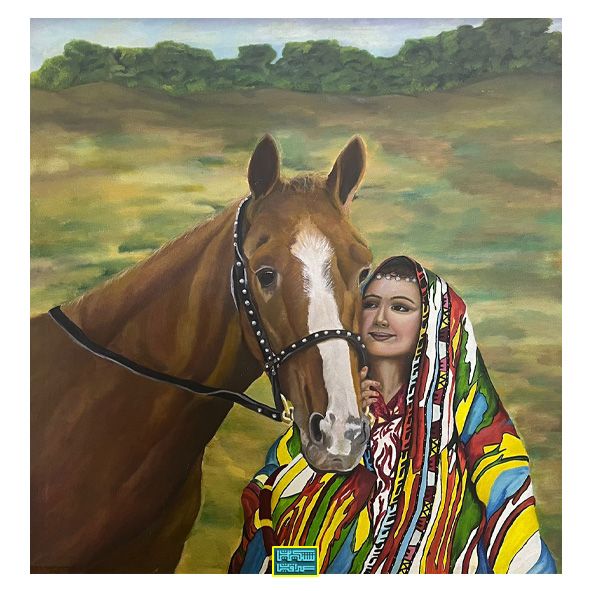 About the work: The painting depicts harmony between a girl in traditional clothing and a horse, in a scene symbolizing authenticity and freedom.
